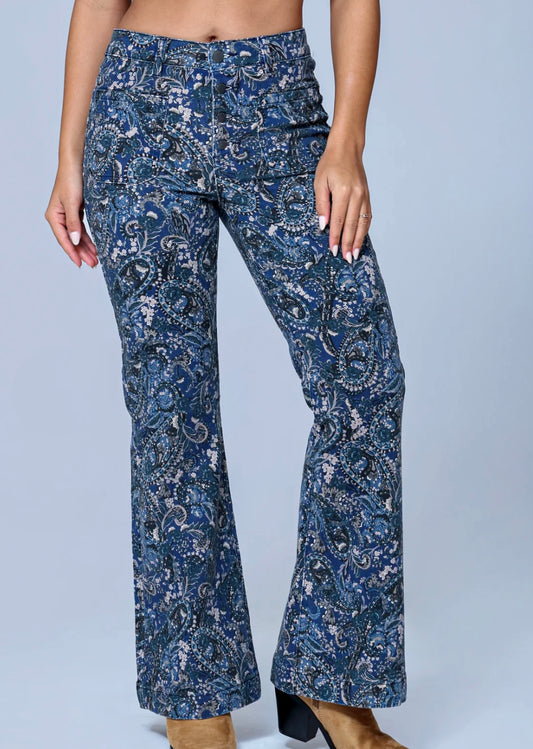 FUNKY SOUL WOMEN'S STRETCH MID RISE PAISLEY PRINT FLARE JEAN